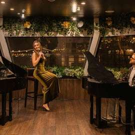 Stap aan boord van een comfortabele en ruime catamaran en geniet van het meeslepende optreden van de pianist, die de hele avond voor een opgewekte sfeer zorgt. Luister naar een prachtige zangeres die zich bij het optreden voegt en de emotie van de muziek nog meer versterkt.