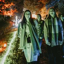 Loop over een gloeiend pad dat wordt verlicht door meer dan honderd spectaculaire lichtinstallaties.