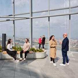 Geniet van een panoramisch uitzicht over Boedapest vanaf het SkyDeck op de MOL Campus. Gebruik de AR-app SkyDeck om de stad en zijn bezienswaardigheden te verkennen.